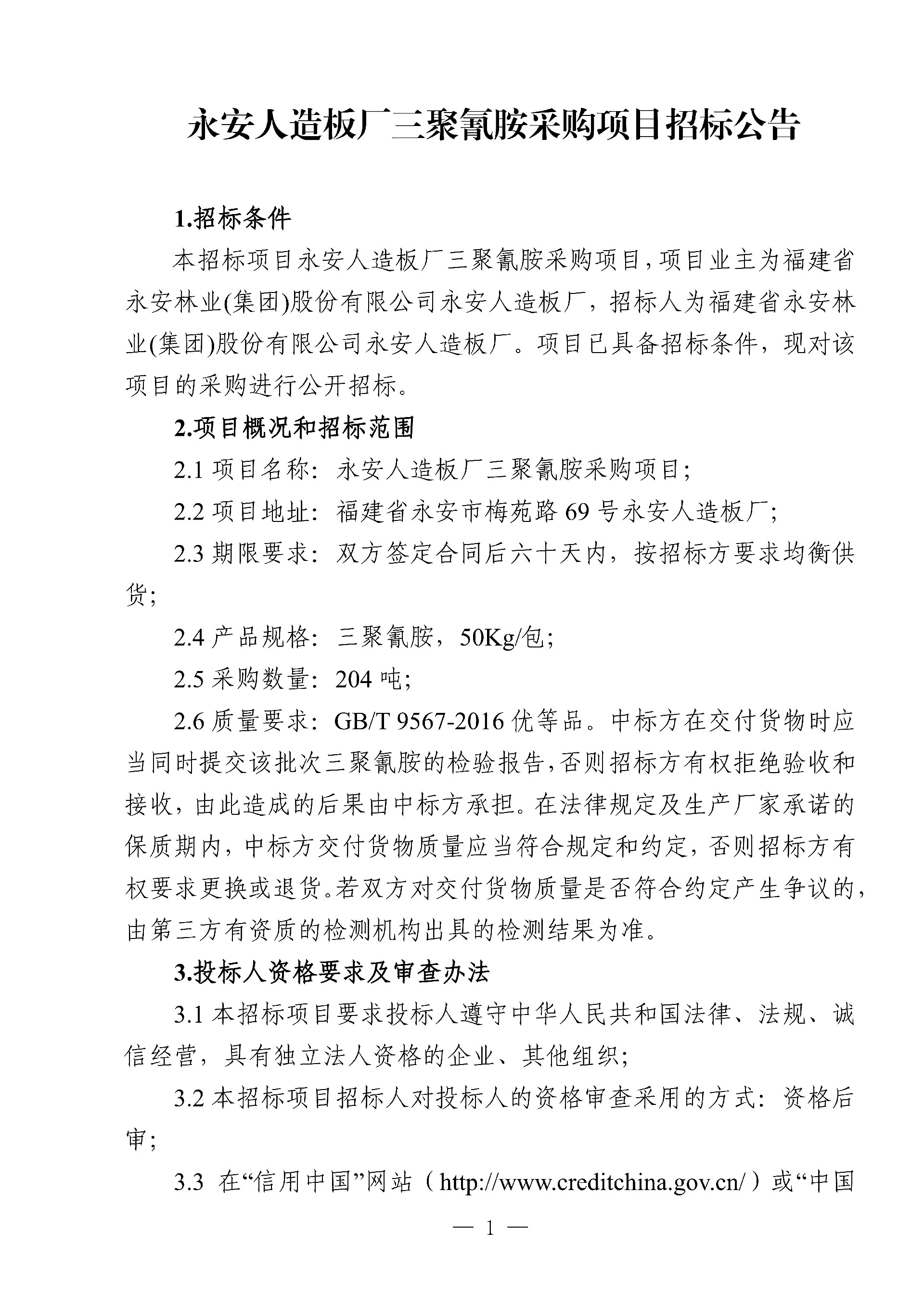 永安人造板廠三聚氰胺采購項目招標(biāo)公告