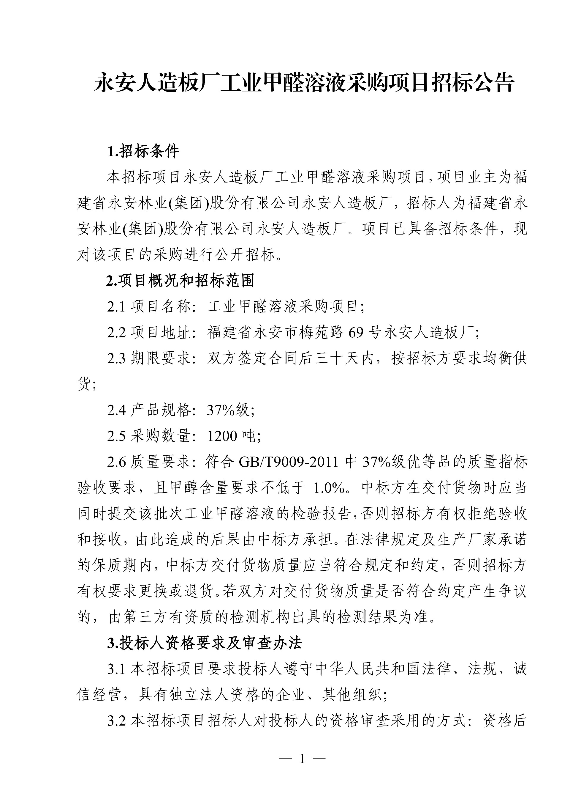 永安人造板廠工業(yè)甲醛溶液采購項(xiàng)目招標(biāo)公告