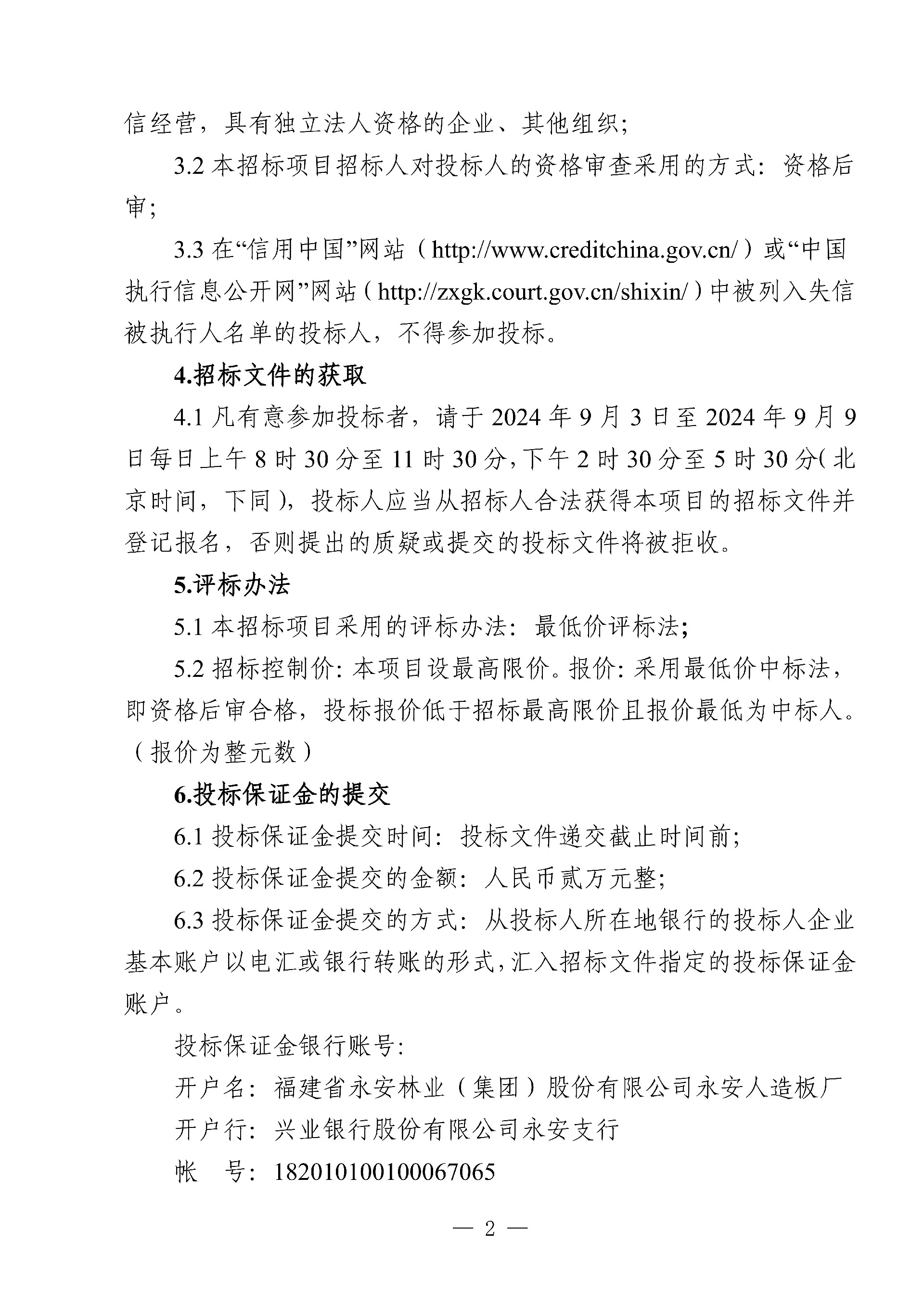 永安人造板廠工業(yè)甲醛溶液采購項目(二次招標)招標公告