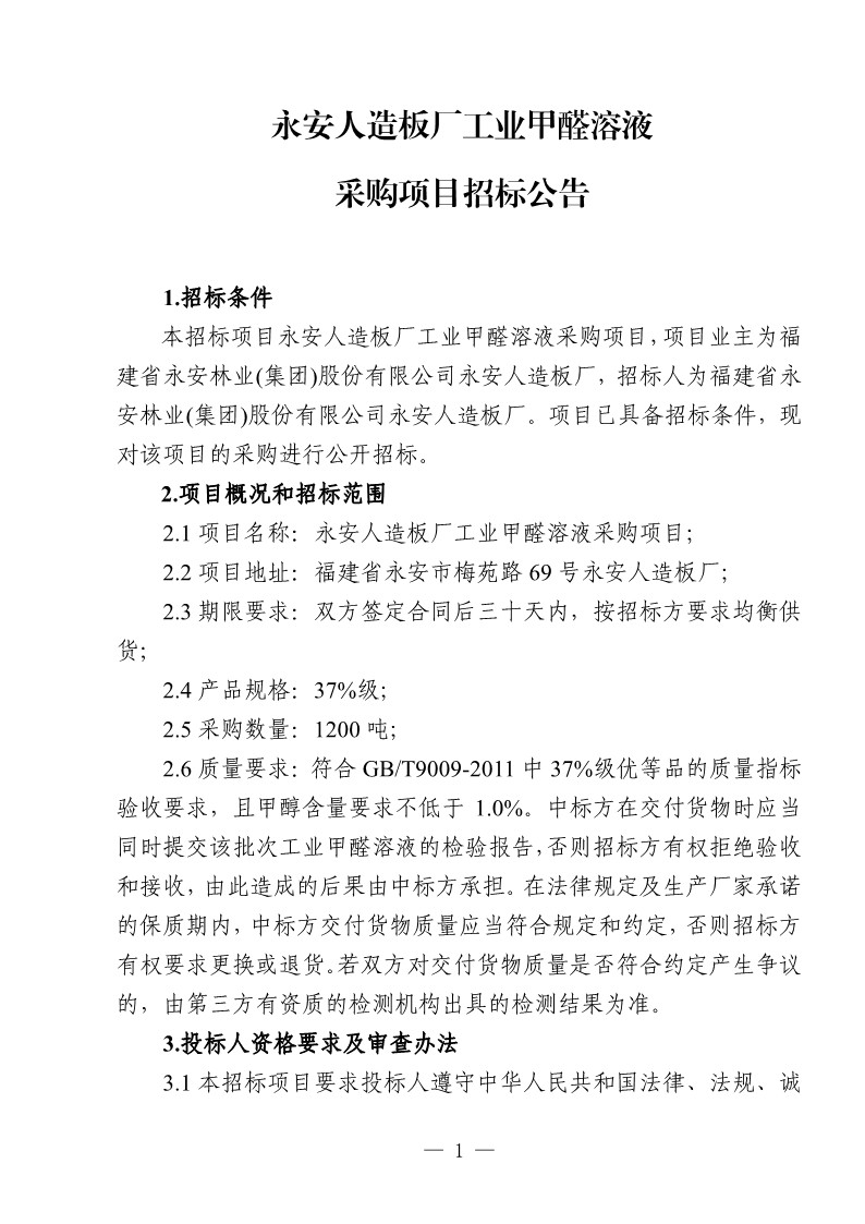 永安人造板廠工業(yè)甲醛溶液采購(gòu)項(xiàng)目招標(biāo)公告