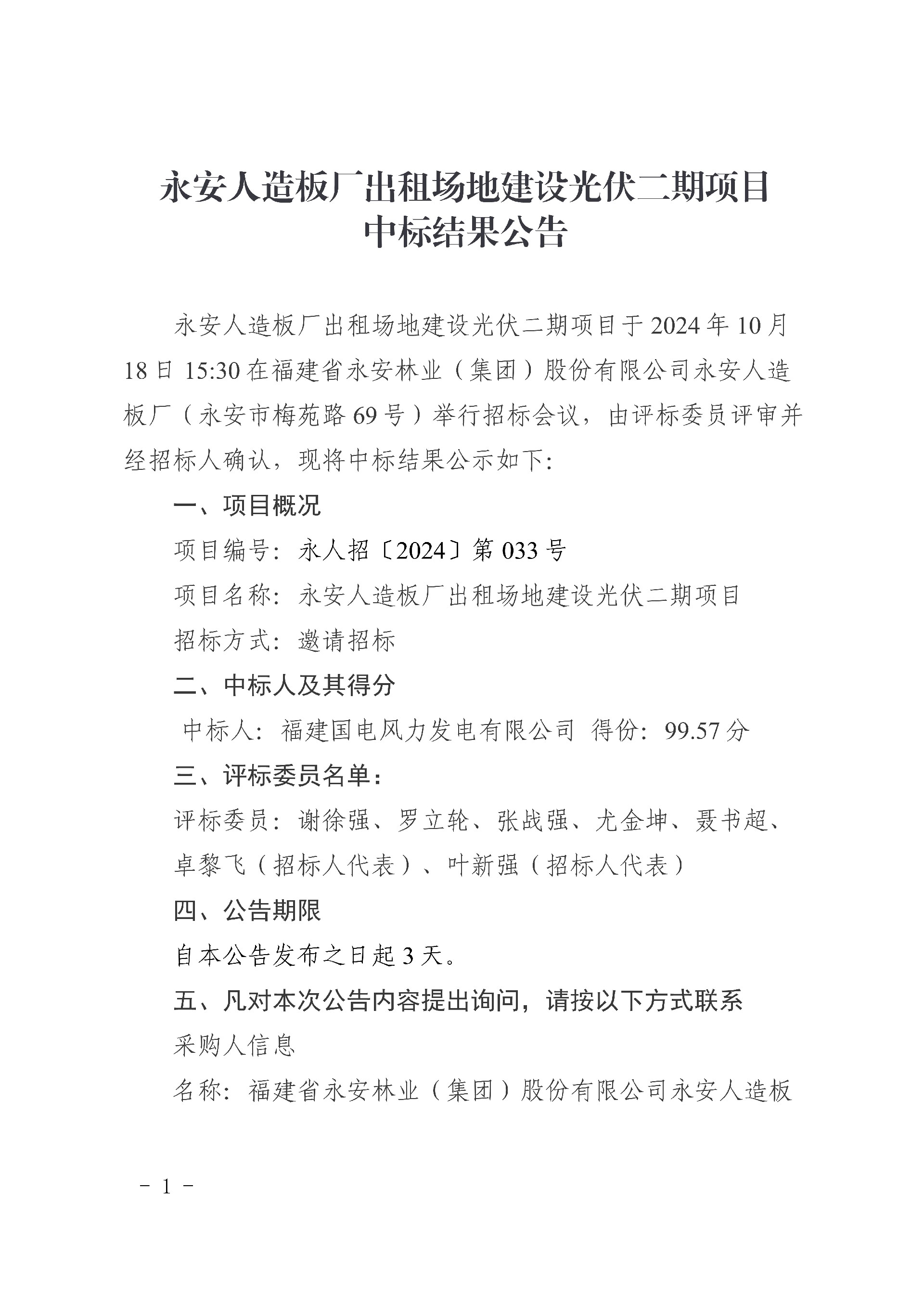 永安人造板廠出租場地建設光伏二期項目中標結果公告