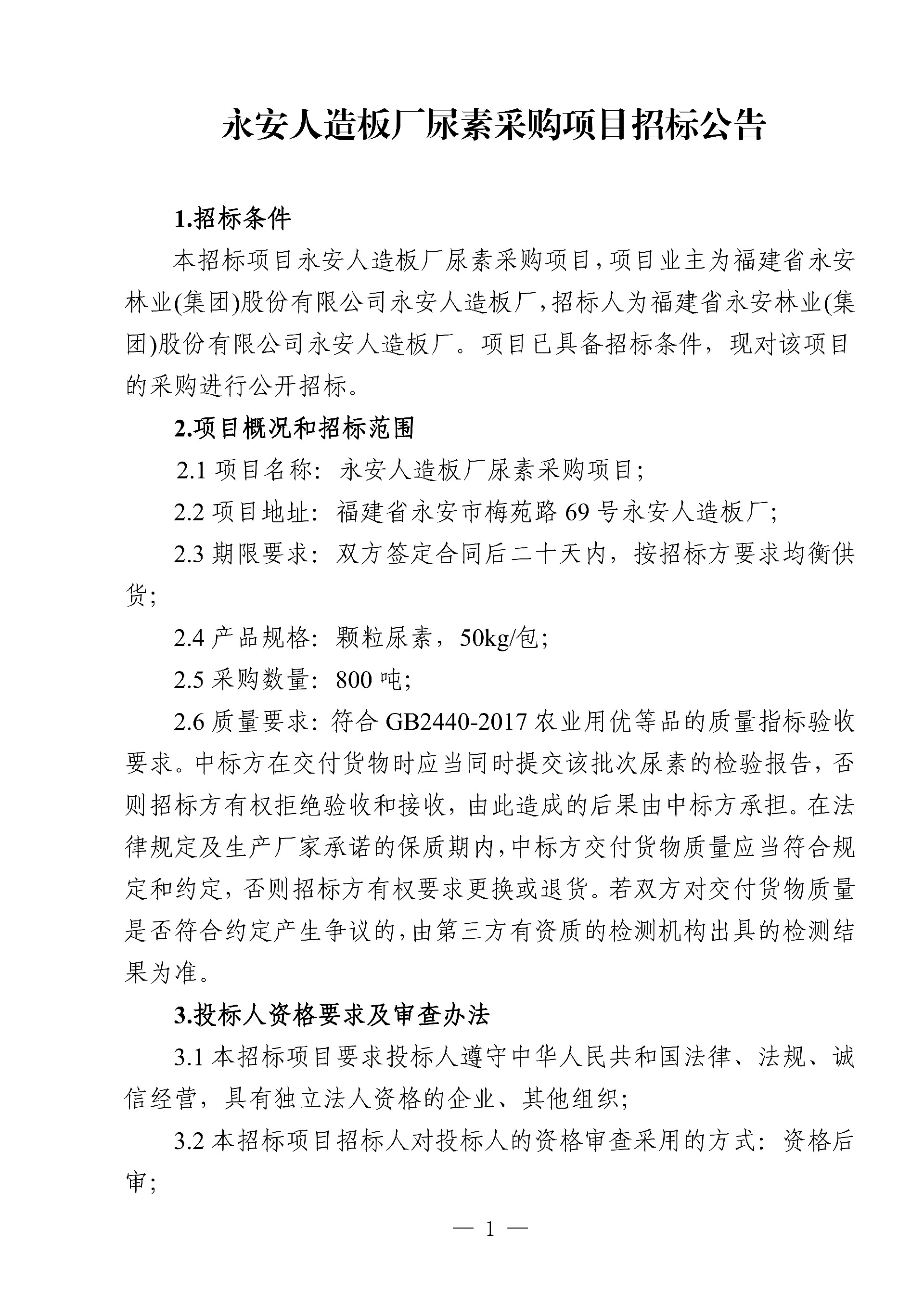 永安人造板廠尿素采購(gòu)項(xiàng)目招標(biāo)公告