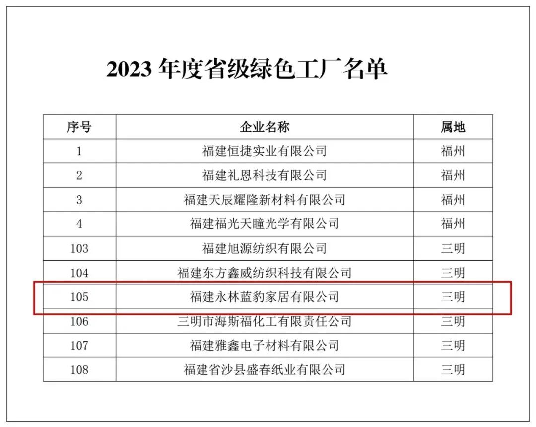 近日,福建省工業(yè)和信息化廳公布2023年度省級(jí)綠色制造名單,永安林業(yè)下屬全資子公司——福建永林藍(lán)豹家居有限公司成功入選該名單。永安林業(yè)企業(yè)綠色高質(zhì)量發(fā)展再添新績(jī)。