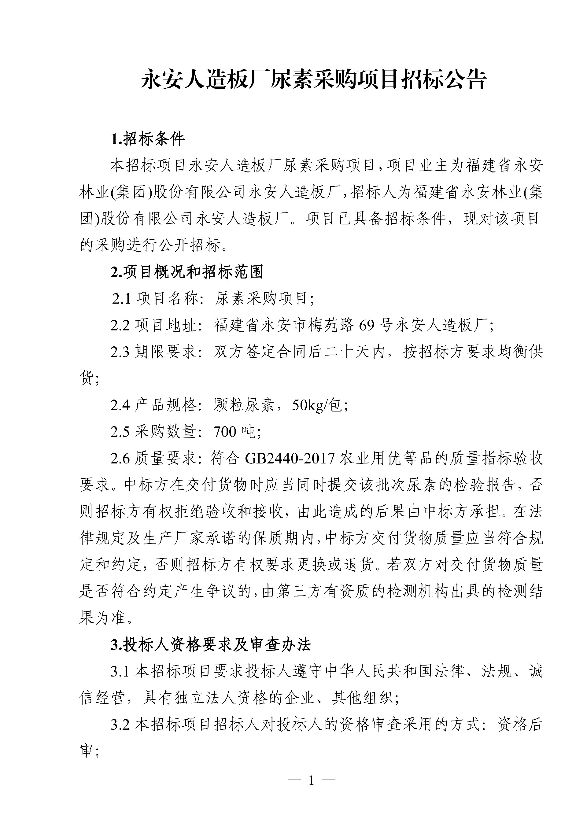 永安人造板廠尿素采購項目招標(biāo)公告