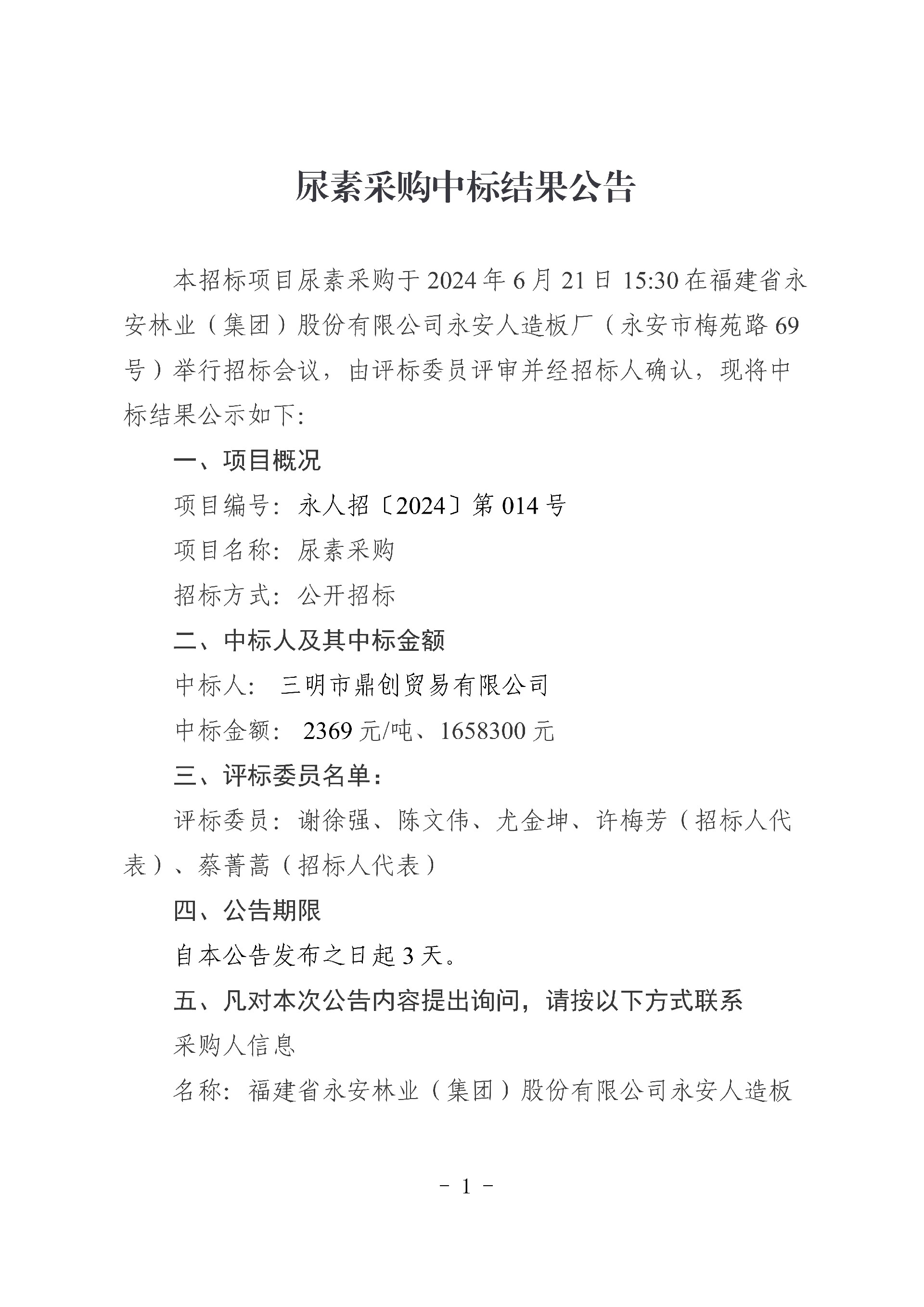 永安人造板廠尿素采購中標(biāo)結(jié)果公告