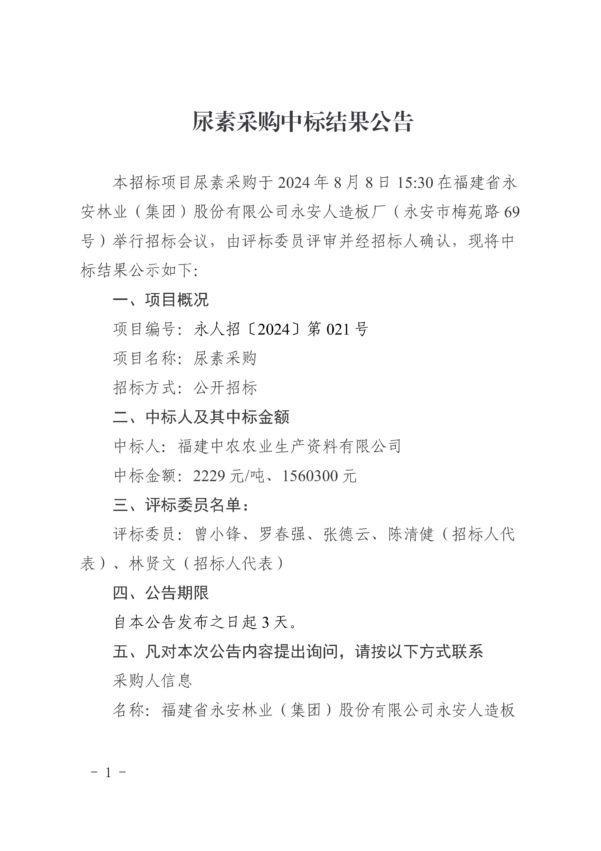 永安人造板廠尿素采購(gòu)中標(biāo)結(jié)果公告