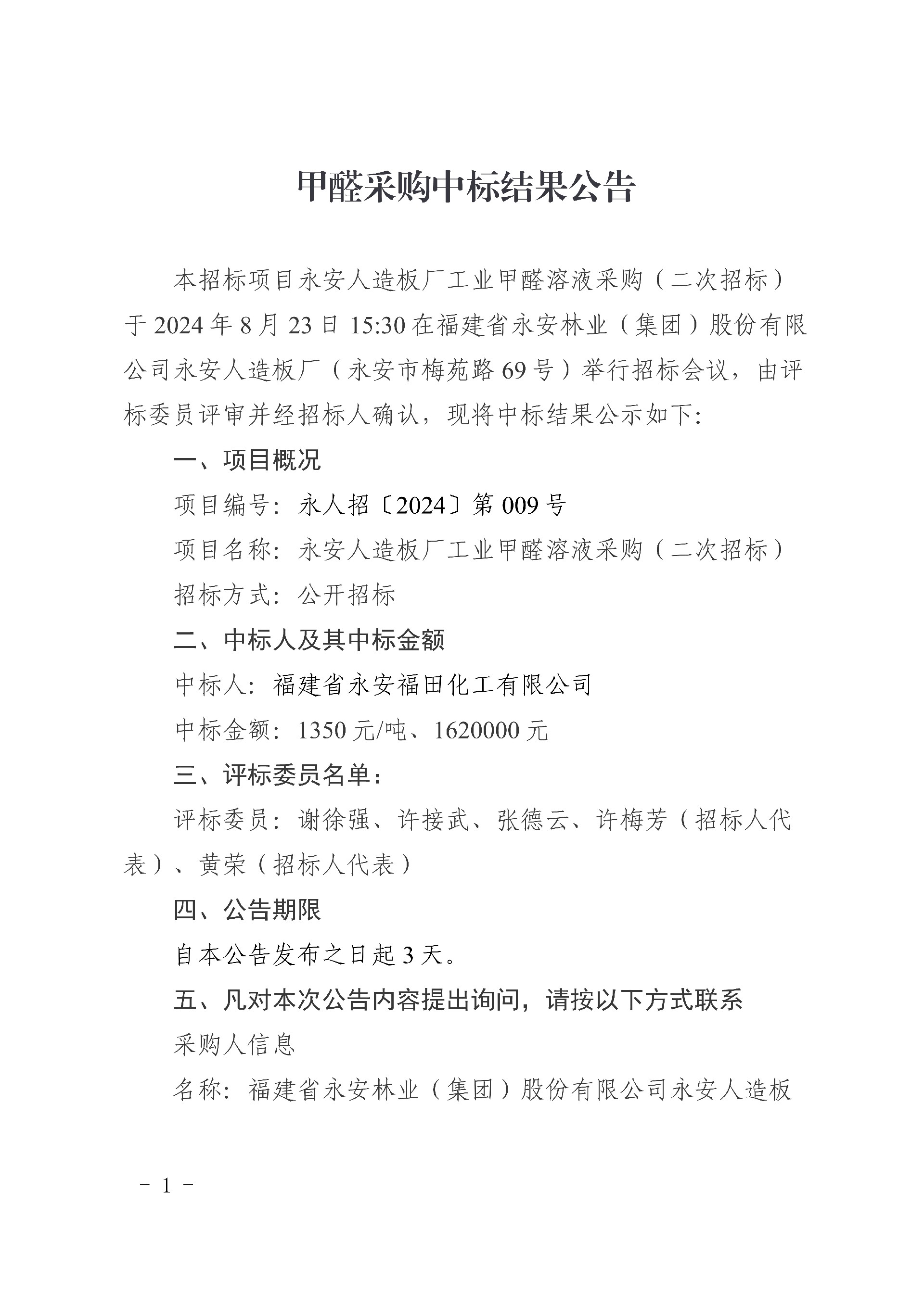 永安人造板廠(chǎng)甲醛采購(gòu)中標(biāo)結(jié)果公告