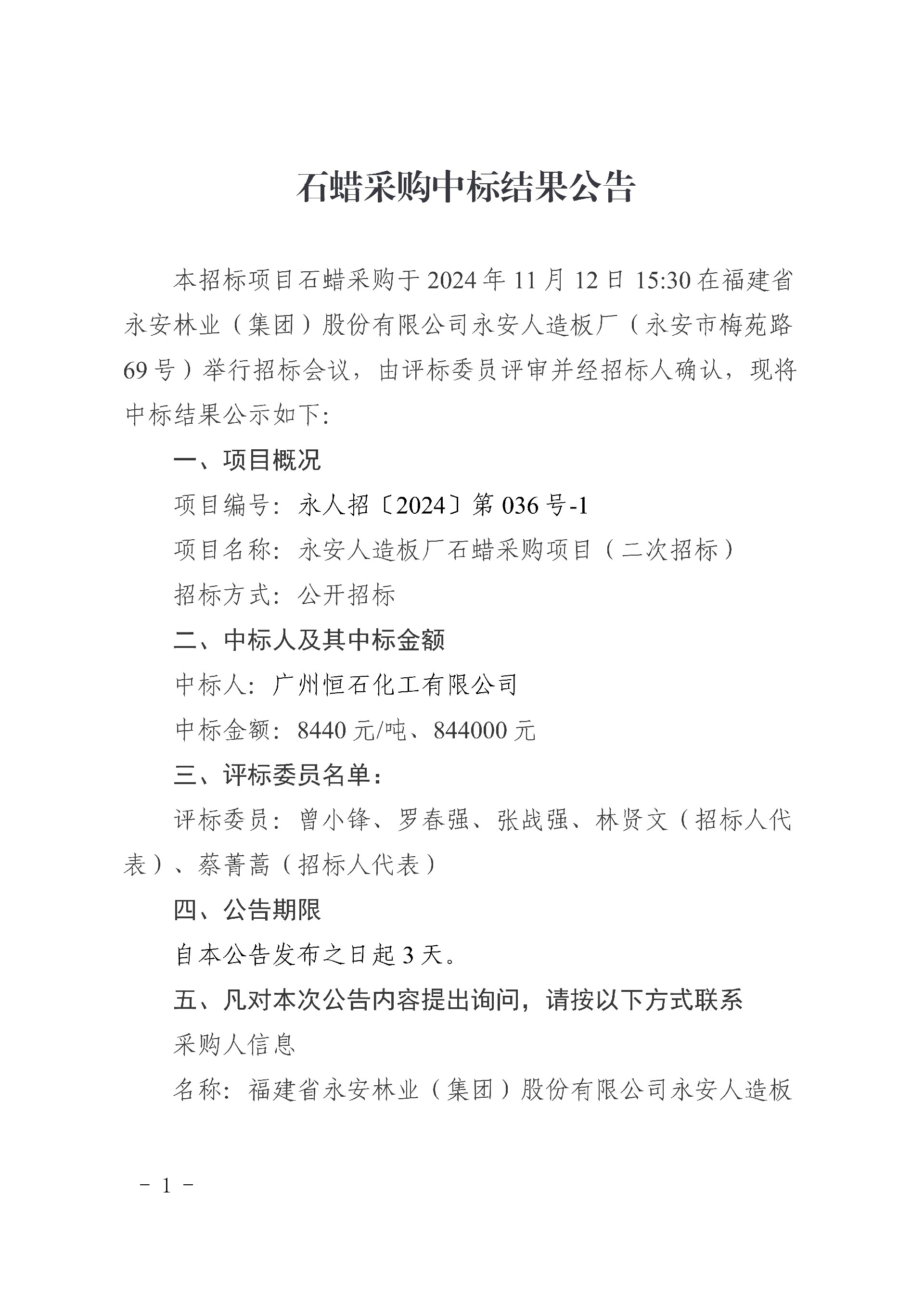 永安人造板廠石蠟采購(gòu)中標(biāo)結(jié)果公告