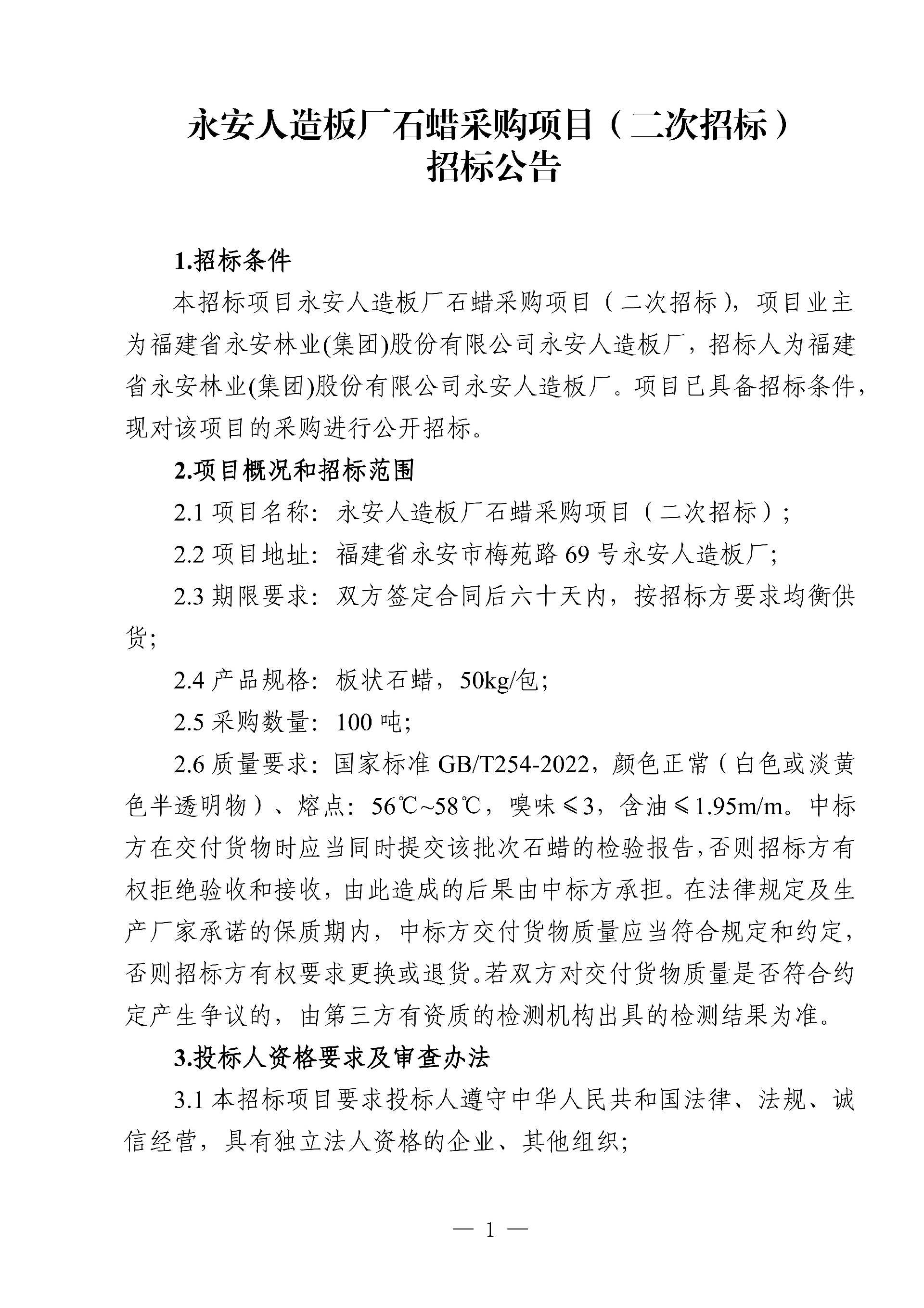 永安人造板廠石蠟采購項目(二次招標)招標公告