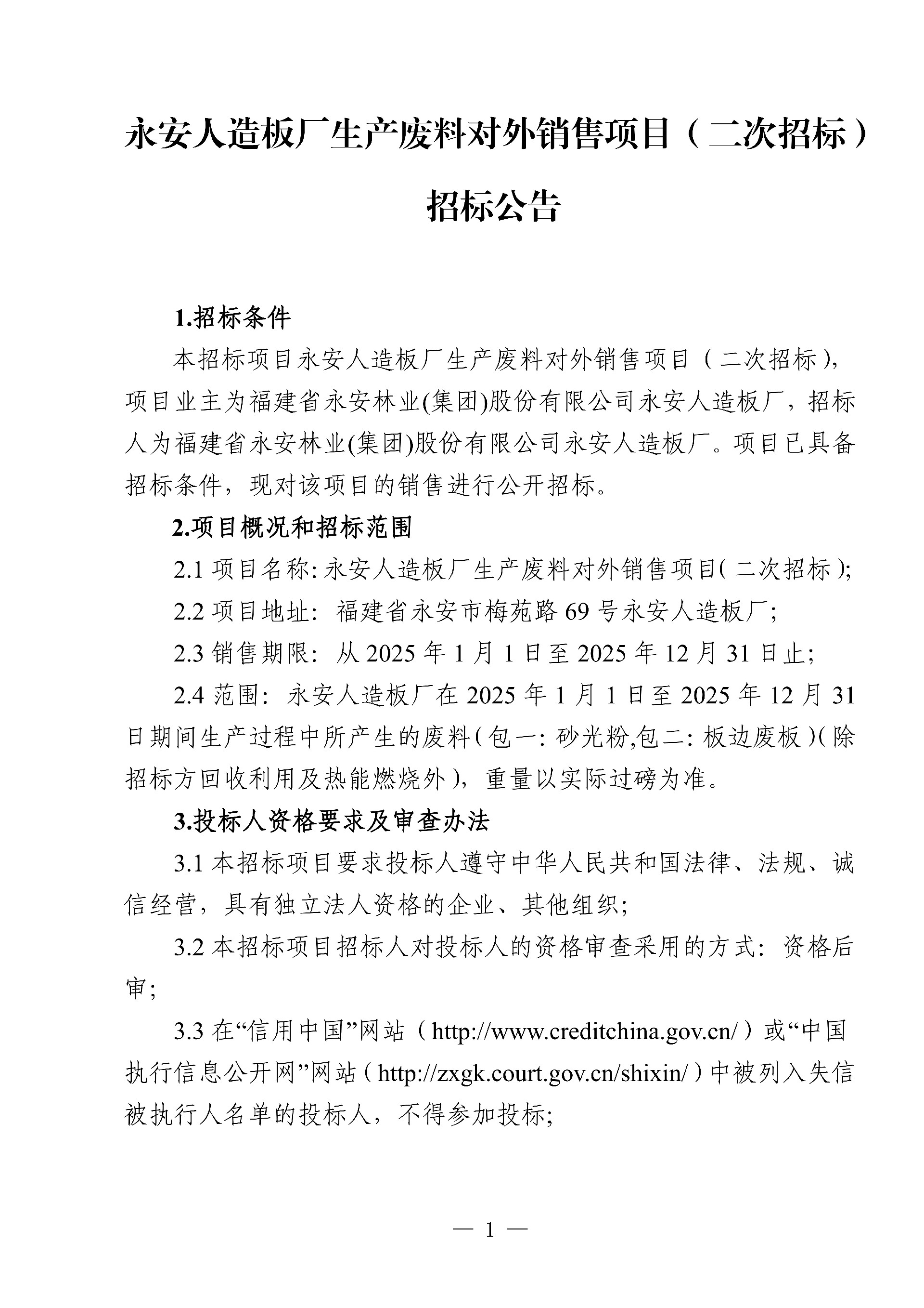 永安人造板廠生產(chǎn)廢料對外銷售項目(二次招標(biāo))招標(biāo)公告