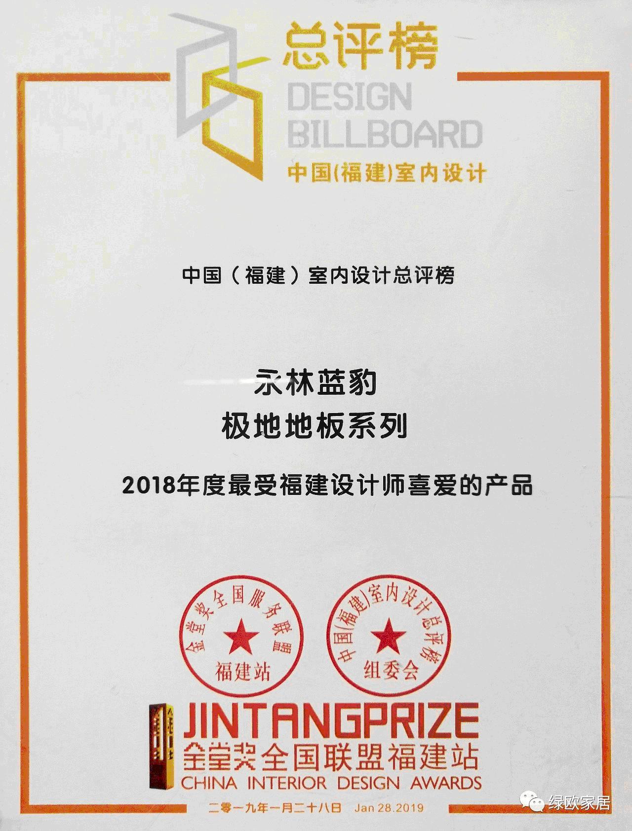 永林藍豹極地地板憑借 無醛、耐水、耐磨專利技術創(chuàng)新精神,尤其是在耐水滲透強、地熱、隔音、耐磨、彈性等方面有其它合材料無法比擬的優(yōu)點,同時秉承永林藍豹獨有的多項防潮專利技術為基礎,防潮性能強,吸水厚度膨脹率遠低于國家標準,特別適合南方潮濕氣候和北方地熱家居需求等優(yōu)點,被評選為“金堂獎2018中國(福建)室內設計總評榜?年度最受福建設計師喜愛的產品”榮譽。