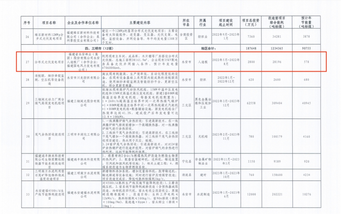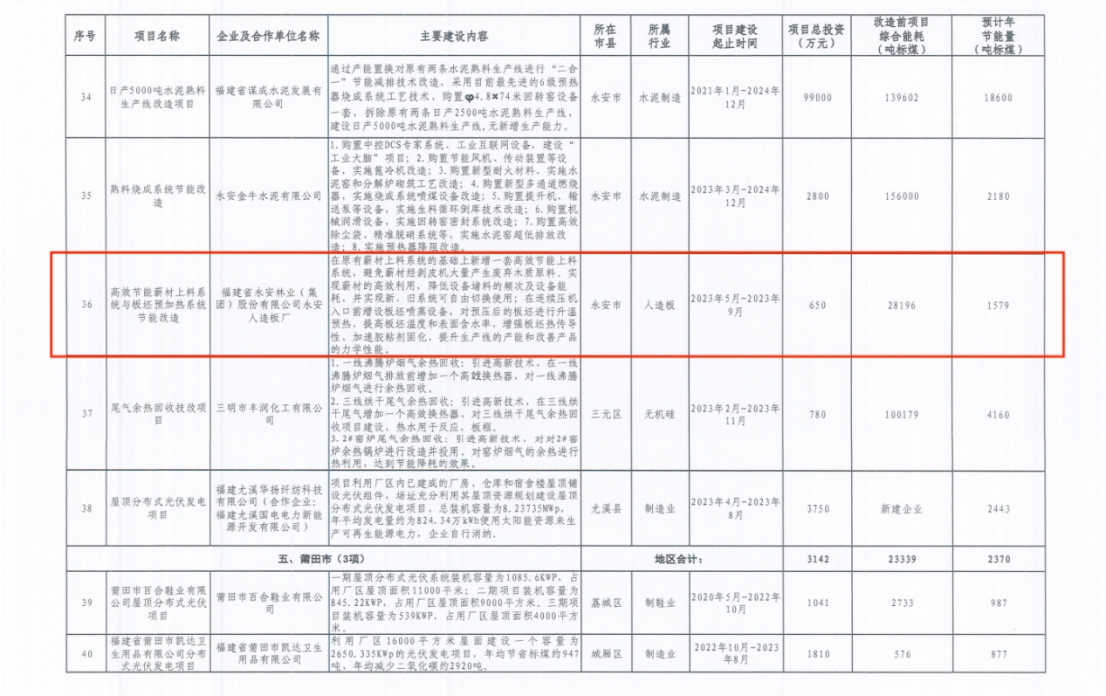 近日,福建省工業(yè)和信息化廳公布了2023年省工業(yè)重點(diǎn)節(jié)能改造項(xiàng)目名單,福建省永安林業(yè)(集團(tuán))股份有限公司下屬永安人造板廠的分布式光伏發(fā)電項(xiàng)目、高效節(jié)能薪材上料系統(tǒng)與板坯預(yù)加熱系統(tǒng)節(jié)能改造項(xiàng)目成功入選。