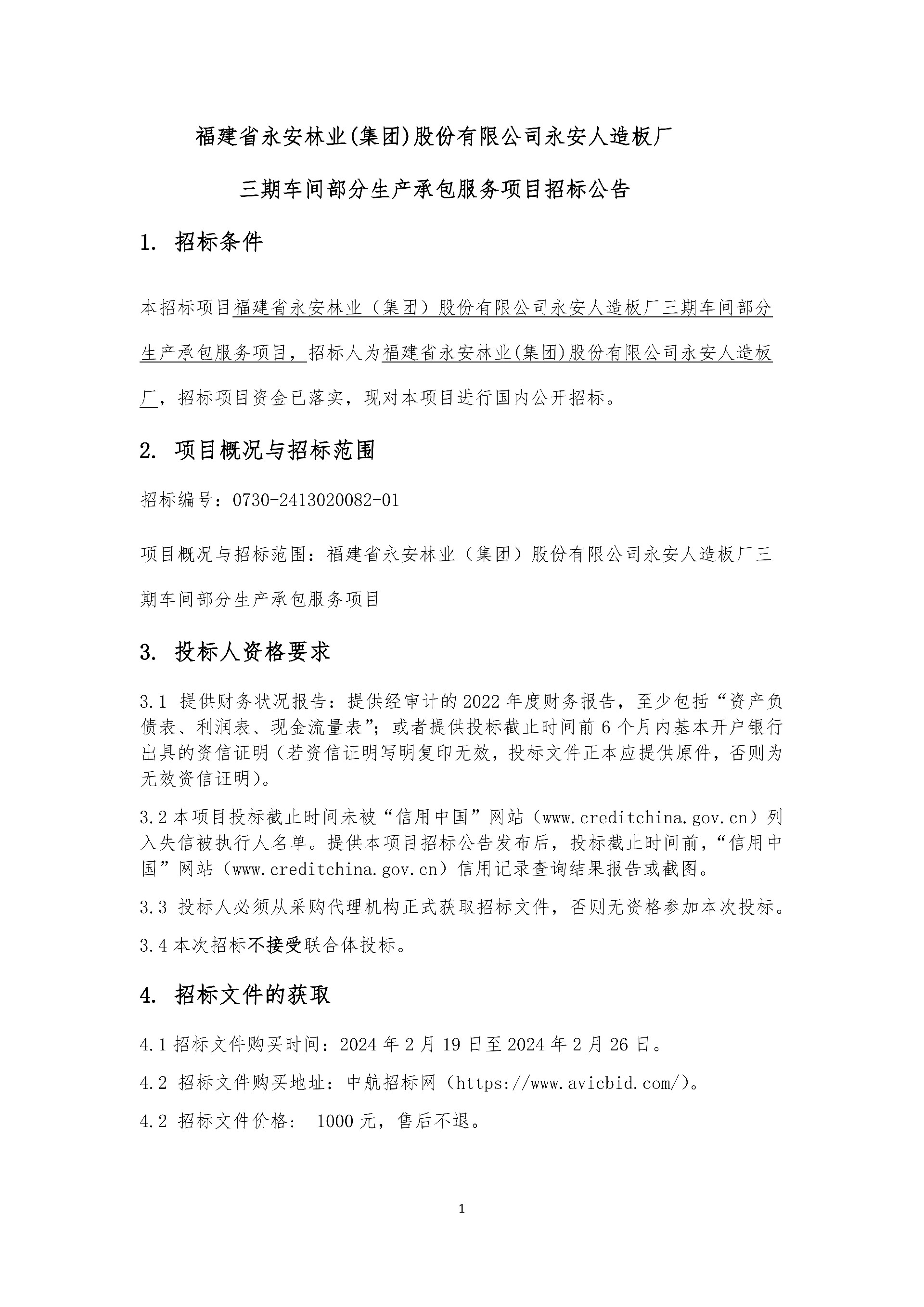 永安人造板廠三期車間部分生產(chǎn)承包服務項目招標公告